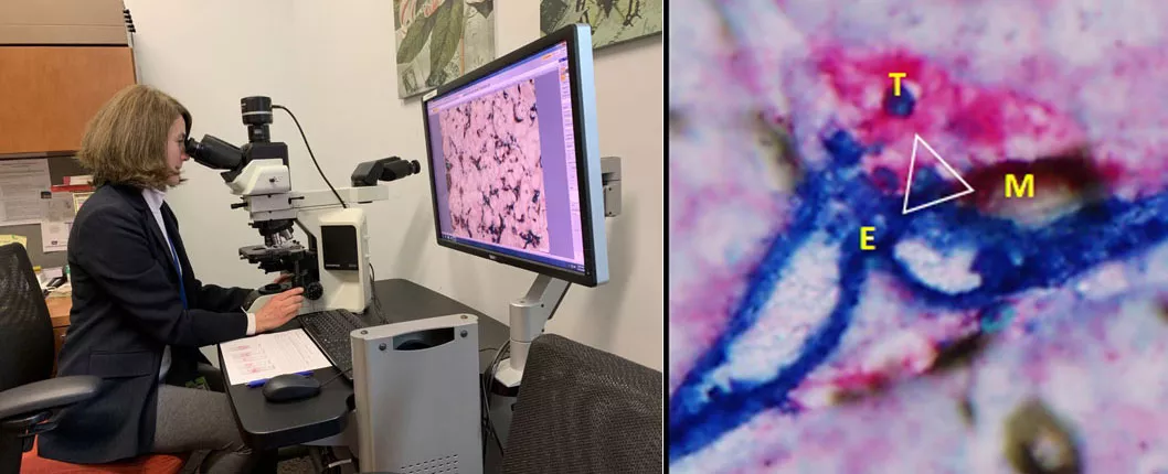 L: Maja Oktay, MD, PhD; Dr. Oktay views an image of TMEM doorways in metastatic focus found in the liver from pancreatic ductal adenocarcinoma.