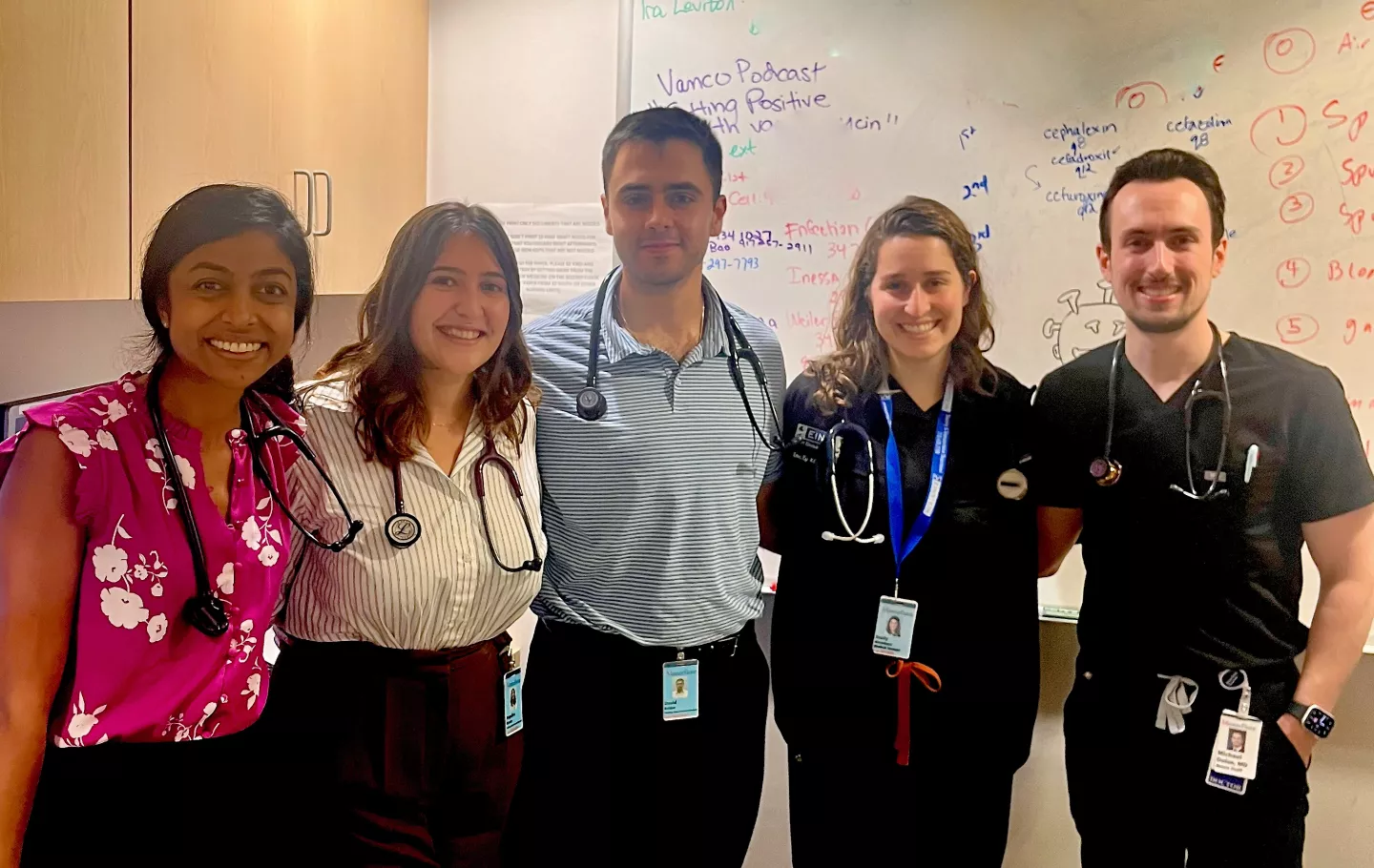 Dr. Shilpa Vasishta (far left), Weiler Hospital site leader for clerkships in subspecialty medicine, with students and Dr. Michael Dolan, fellow in the division of infectious diseases (far right).